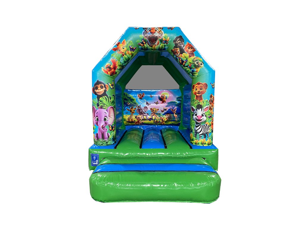 Skákací hrad „ÁČKO“ – Jungle je kompaktní hrad s pevnou střechou s motivy zvířátek, jungle, Afriky.